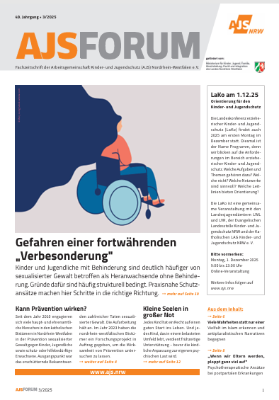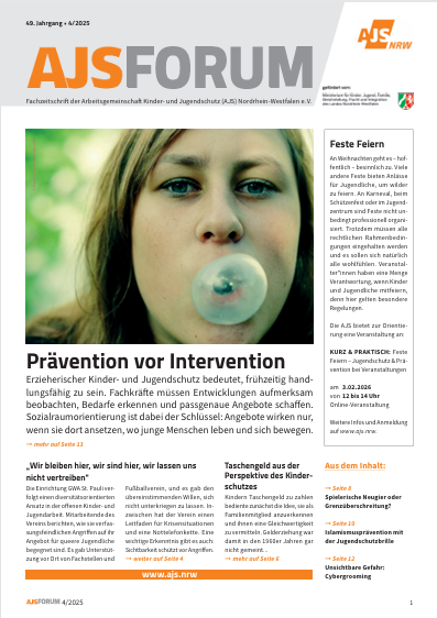 Die Fachzeitschrift der AJS zu aktuellen Themen des erzieherischen und gesetzlichen Kinder- und Jugendschutzes: Das AJS FORUM erscheint viermal im Jahr und ist im Jahresabonnement für 12 Euro erhältlich. Zudem stellen wir den jeweiligen Aufmacherartikel der aktuellen Ausgabe sowie viele ältere Ausgaben kostenfrei zum Download zur Verfügung.